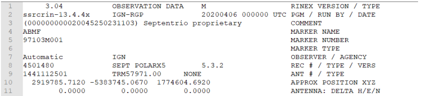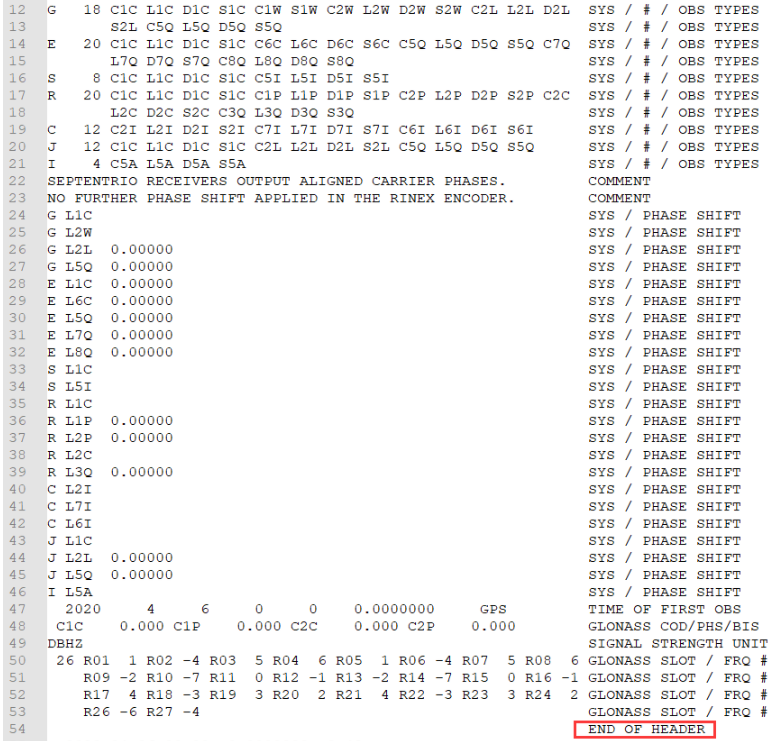RINEX VERSION/TYPE:RINEX格式的版本号(本版本为3.04)/文件类型(为观测文件o)/观测数据所属卫星系统:(空格或G为GPS,R为GLONASS,S为地球同步卫星信号有效载荷(SBAS payload),T为NNSS子午卫星,M为混合系统,E为Galileo,C:BeiDou,J:QZSS,I:IRNSS)