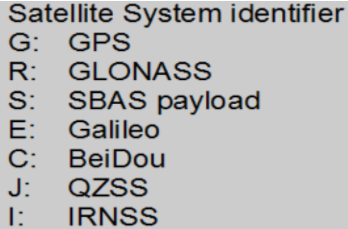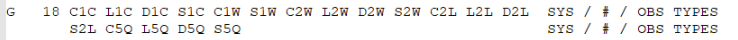 数据类型都是由三个字符组成,首先第一个字符:C伪距;L载波;D多普勒;S信号强度;第二个字符是数字,代表频数编号;第三个字符表示跟踪模式或通道,比如常用的C C/A码,S LxC(D);L LxC(P);X LxC(D +P);P AS off; W AS on;Y Y码;M M码