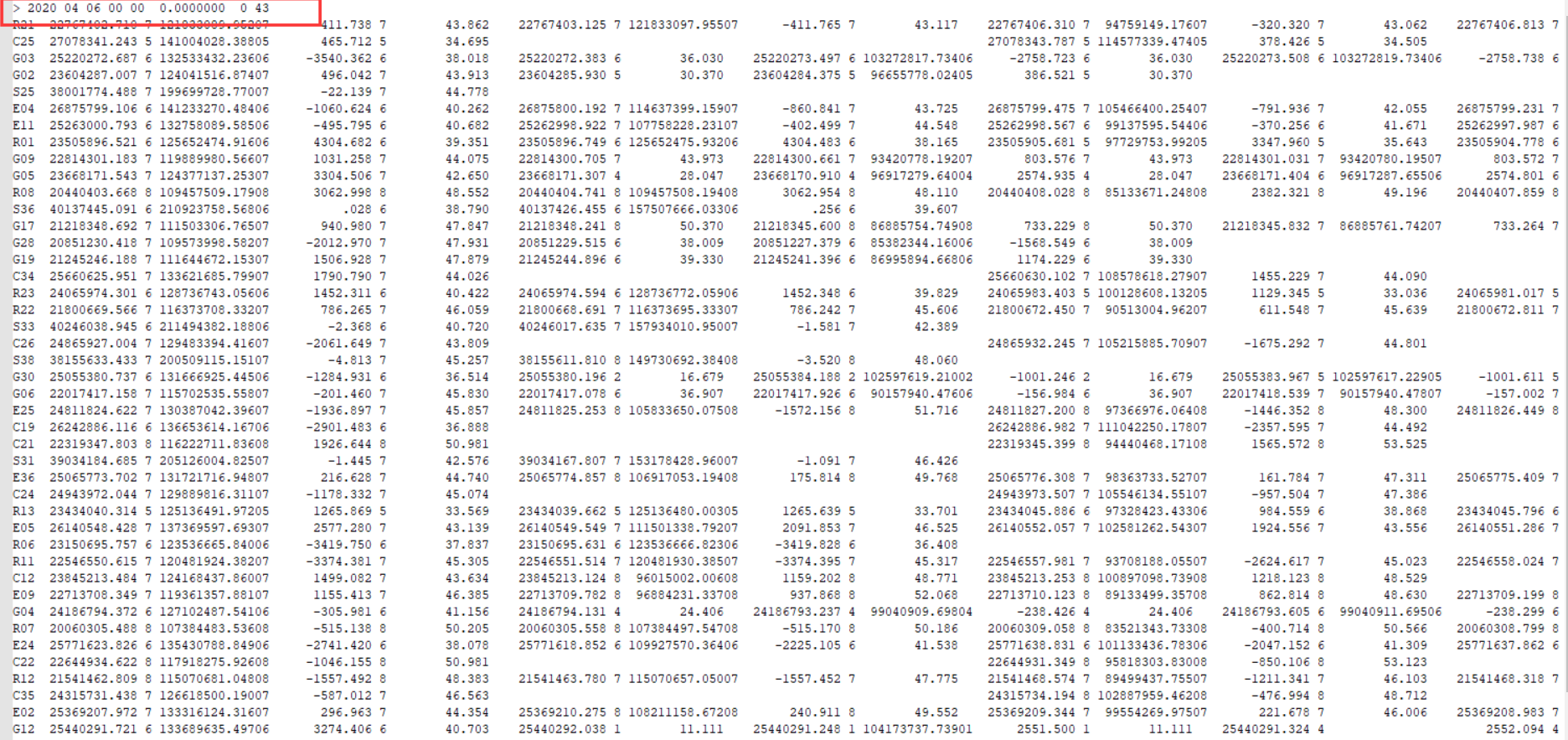 依次为:年2020年04月06时00分00秒0.000000秒+历元标志0+当前历元所观测到的卫星数43。关于历元标志,0表示正常,1表示在前一历元和当前历元之间发生了电源故障>1表示事件标志。