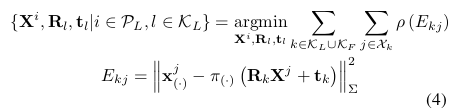 只有运动的BA:优化相机方向R(属于SO(3))和位置t,最小化匹配的世界坐标系下的3D点的重投影误差,要么单目x(i,m)或者双目x(i,s),i属于X是所有的匹配集合;