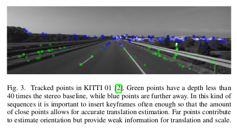 一个双目特征点被分类为近点如果它相关的深度小于40倍的双目或者RGB-D的基线,否则被称为远点。近点 在精确估计深度时,可以从一帧中安全地三角化关键点 ,提供尺度,平移和旋转信息。另一方面远点提供精确的旋转信息但是较弱的尺度和平移信息。当由多视角支持时,我们三角化远点。