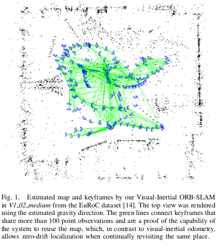 摘要-近年来,在视觉里程计技术中有许多优秀的作品,其目的是比较高精度,鲁棒地计算传感器增量运动。然而这些方法都缺乏回环的能力,即使传感器连续重新回到同一地方,轨迹的估计会累积漂移。本文提出了一种新颖的轻耦合的视觉惯导SLAM系统,能够回环检测以及重用地图来获得无漂移的定位模式。本方法可以应用于任何相机配置,本文解决了单目相机大部分的问题,众所周知的尺度不确定性。我们也提出了一种新颖的IMU初始化方法,其计算了尺度,重力方向,速度和陀螺仪加速度计偏置,在几秒钟的时间内且精度高。在最近的微无人机公开数据集上测试获得了典型的尺度误差在1%且厘米的精度。相比于当前的VIO在重新访问场景,本方法提供了更好的精度由于地图的重用和无漂移的累计。