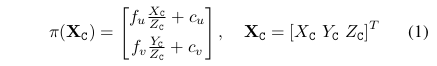 我们的视觉惯导ORB-SLAM的输入是一个IMU观测和单目相机的流。我们用一个映射函数牌来表示一个常规的针孔模型,R 3 → Ω,其将3D点Xc在相机坐标系C中转换到了图像平面xc中的2D点。