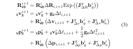 在连续两帧之间的运动可以用预积分δR,δv和δP从这两帧之间的所有测量来定义。我们使用最近的IMU预积分描述