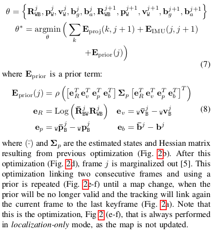 如图2-a,当跟踪在地图更新之后被执行,IMU误差项将当前帧j与上一帧i相连接: