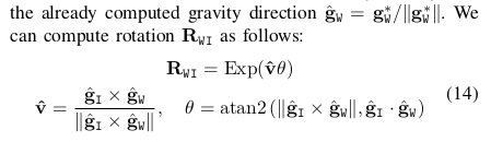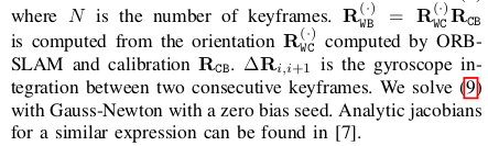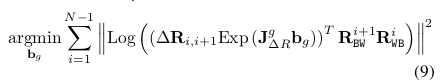 陀螺仪偏置可以被估计从两个连续的帧的已知方向中。假设一个可忽略的偏置变化,我们优化一个常偏置bg,这最小化来自于相对方向的计算和陀螺仪积分之间的不同,对于所有的连续帧的匹配: