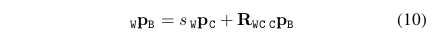 由ORB-SLAM计算的相机轨迹的尺度是任意的。因此我们需要包括一个尺度因子s,当在相机C和IMU B坐标系之间变换时: