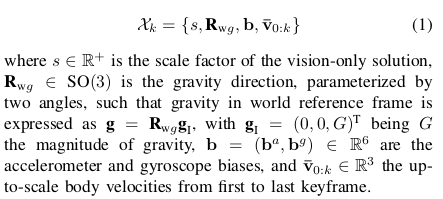 我们更喜欢使用最大比例的速度v̄i,而不是真正的速度v i=sv̄i,因为它简化了初始化过程。假设所有涉及的关键帧的偏移都是恒定的,因为初始化周期仅为1-2秒,随机行走几乎不会产生任何影响。值得注意的是,该公式从一开始就考虑了重力大小,而[7]和[5]则需要单独的步骤来确定其值。