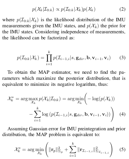 4)我们不假设IMU偏差为零,而是将关于它们的已知信息编码为概率先验,由我们的MAP估计利用。