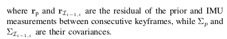 在这种优化中,视觉重投影误差不会出现,只有惯性残差。由于IMU测量不受数据关联错误的影响,因此使用稳健的成本函数(如Huber范数)是没有意义的,因为这会降低优化速度。