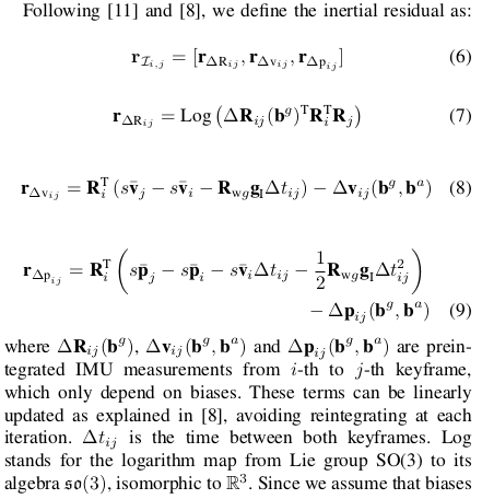 在我们的案例中,使用的唯一测量值来自IMU,并在[8]中定义的IMU预积分项中进行了总结。我们用I I,j表示第I个和第j个关键帧之间惯性测量的预积分,用I 0:k表示初始化窗口中连续关键帧之间的IMU预积分集。
