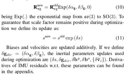 在优化结束时,使用找到的比例值缩放帧姿态和速度以及3D地图点,并旋转以使z轴与估计的重力方向对齐。IMU预积分使用新的偏差估计重复,旨在减少未来的线性化误差。