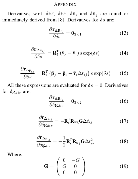 4)与[5][7]不同,我们在一个步骤中联合优化了所有IMU变量,同时考虑了位置的预积分项与线速度和角速度之间的交叉协方差[8]。
