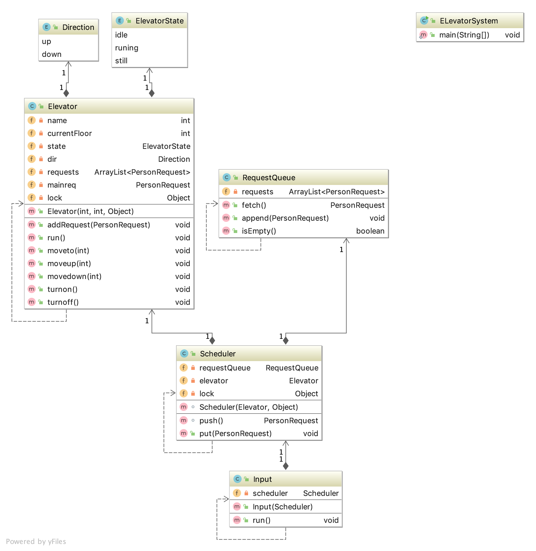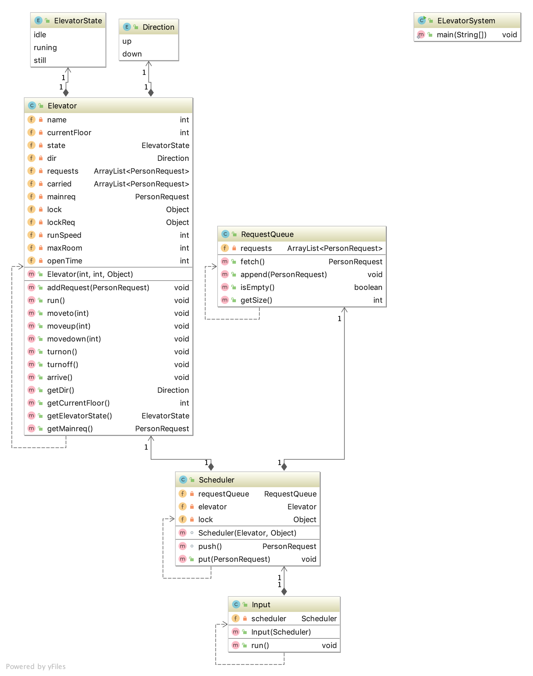 我开了两个线程,一个用于读入数据(Input),一个是电梯运行。为了方便之后的作业,我设计了一个调度类s,将Input和电梯联系起来。