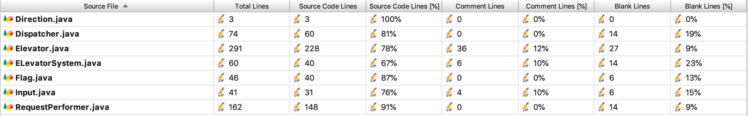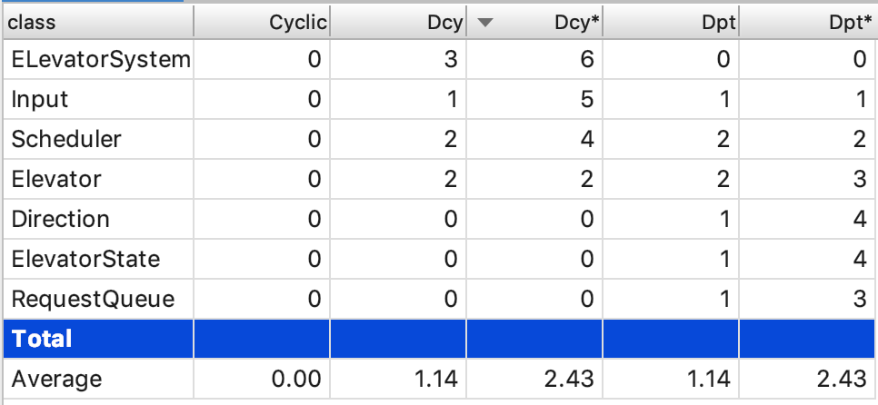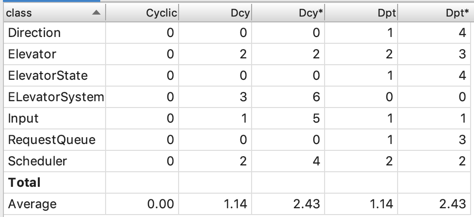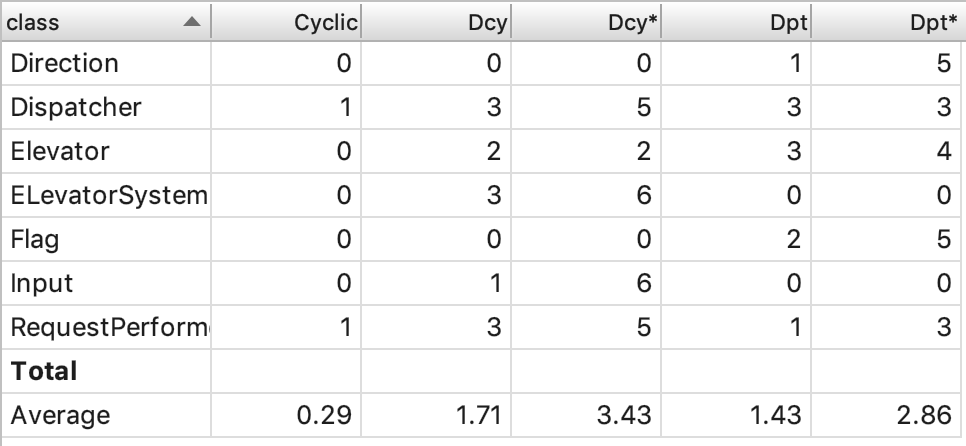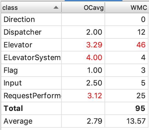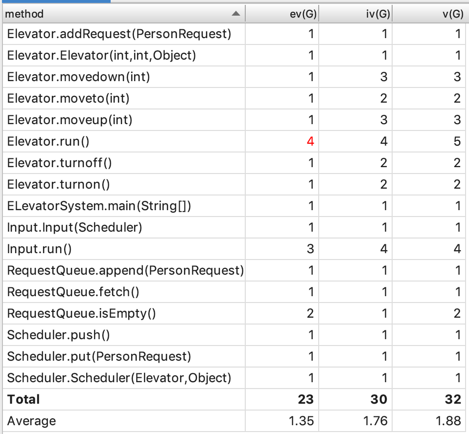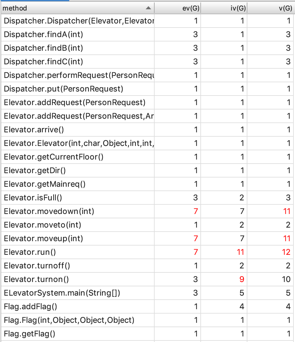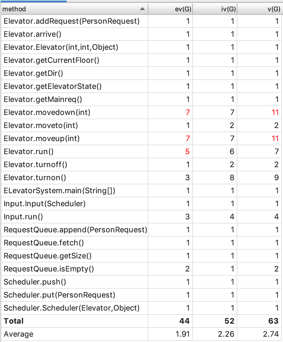 各个类的复杂度中,以Elevator类、main(ElevatorSystem)类和RequestPerform类较高。这也很科学,由于电梯和RequestPerform类各完成了调度一半的工作,其类的复杂度因此较高。而由于我被迫将Input类合并到main类中,导致该类复杂度也出现了问题。
