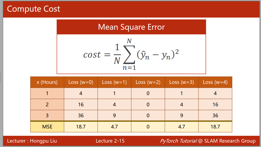 在遇到一个模型时候,我们一般会使用线性模型来测试下,训练的时候我们则考虑 w 和 b 的值来,在机器学习中我们一般使用随机猜测来确定这两个未知量的值,然后通过穷举法来找到最优值,使用损失函数来评估模型的性能,当我们的误差函数值最小的时候,即可以代表最优的性能,通过每个样本的损失函数值,我们可以求得平均平方误差(MSE),来得到样本的综合性能。