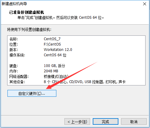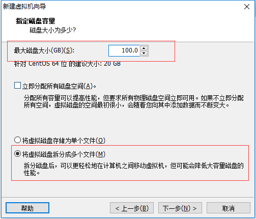 磁盘容量暂时分配100G即可后期可以随时增加,不要勾选立即分配所有磁盘,否则虚拟机会将100G直接分配给CentOS,会导致宿主机所剩硬盘容量减少。