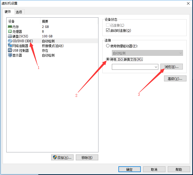先选择CD/DVD,再选择使用ISO映像文件,最后选择浏览找到下载好的镜像文件。启动时连接一定要勾选上后确定。