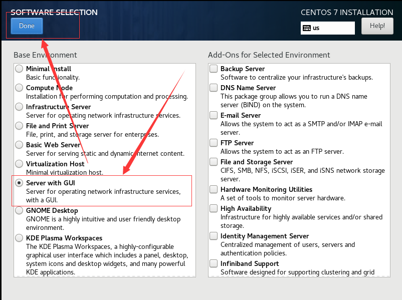 选择 Server with Gui,然后点击Done (该步骤可能会卡一会,稍微等待即可)