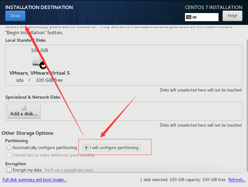 选择i wil configure partitioning(我将会配置分区),然后点击done