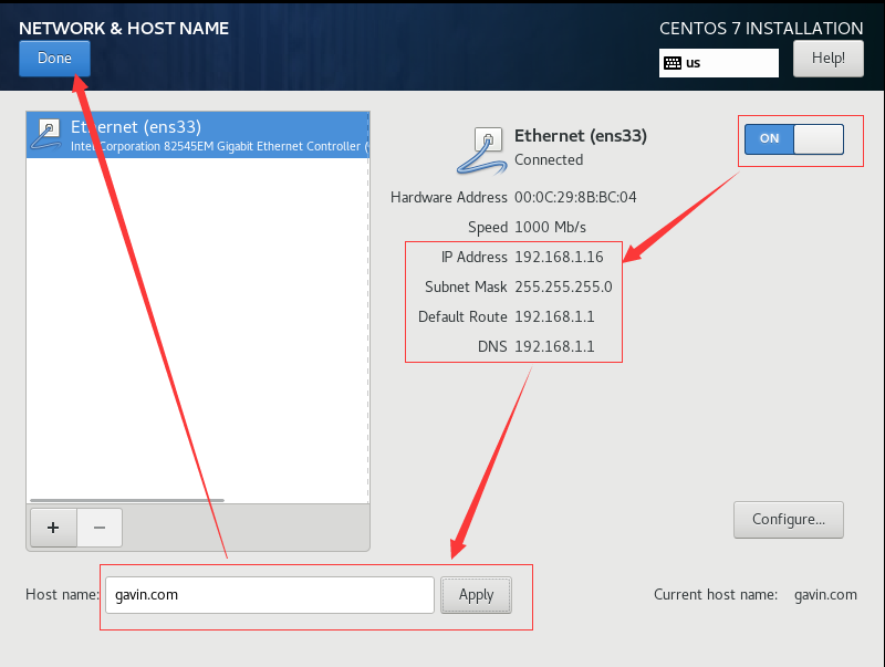 首先要打开网卡,然后查看是否能获取到IP地址(我这里是桥接),再更改主机名后点击Done。