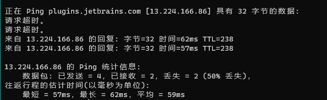 猜想是因为移动网络的原因,于是Terminal ping plugins.jetbrains.com,可以看到请求大多数情况下都是超时。