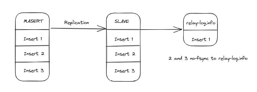 当一个Slave节点在复制数据时,可能发生如下情况, 数据2和数据3写入成功 (且已经落盘),但是relay-info.log中的记录还是数据1的位置(因为 sync_relay_log_info 的关系,此时还没有fsync,如下图所示:
