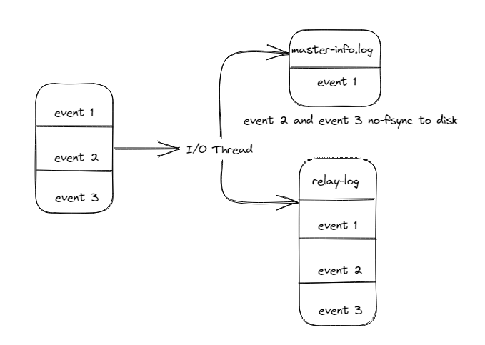 此时如果服务宕机后,MySQL重启,I/O线程会读取master-info.log的内容,读取到的位置为event1的位置,然后I/O线程会继续将event2和event3拉取过来,然后继续写入到relay-log中。
