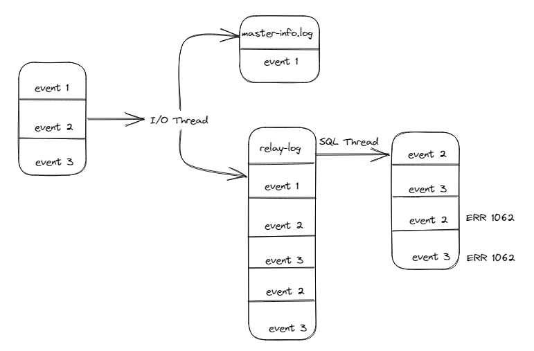 如上图所示,event2和event3被重复写入到了relay-log文件中,当SQL线程回放时,就会产生1062的错误(重复记录)