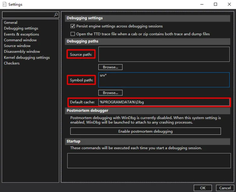 File -> Settings -> Debugging settings,默认的源码路径、符号路径和缓存路径如下: