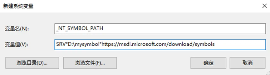 设置_NT_SYMBOL_PATH环境变量的值为SRV*D:\mysymbol*https://msdl.microsoft.com/download/symbols: