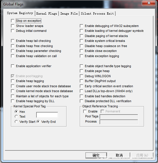 在网上收集资料整理后发现, Image File Execution Options下可以设置以下值项(值只是部分,只能感慨,微软没告诉我们的东西还真多啊)。其中GlobalFlag是本次测试的关键点: