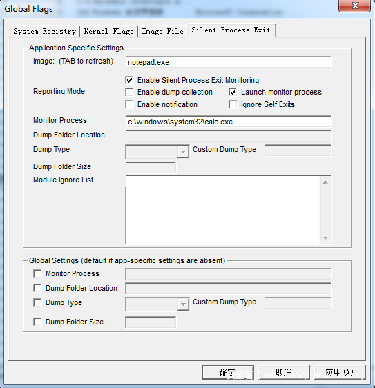 填入如上配置,点击应用、确定,开始测试。使用Process Explorer进行检测进程的变化。注意,在进行此次测试之前,请先把IFEO中notepad.exe项删除。