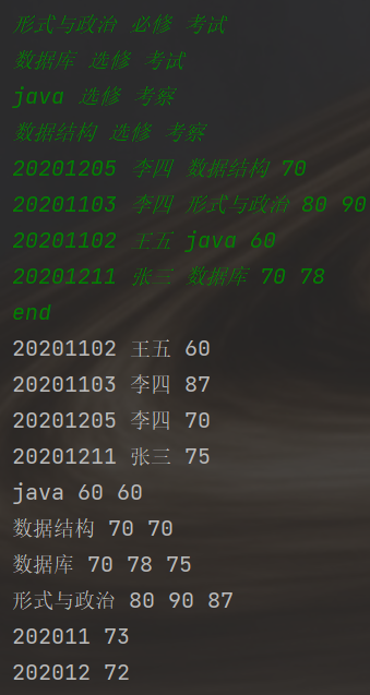 import java.math.BigDecimal; import java.text.Collator; import java.util.*; public class Main { public static void main(String[] args) { CourseSystem courseSystem = new CourseSystem(); Scanner input = new Scanner(System.in); String Input = input.nextLine(); while(!Input.equals("end")) { String []put = Input.split(" "); boolean judgeFlag = false; while(!put[0].matches("[0-9]{1,8}")) { judgeFlag = true; if(put.length == 3 && put[0].matches("^.{1,10}$")) { courseSystem.addCourse(put[0],put[1],put[2],put);//null说明为考察 break; } else if (put[0].matches("^.{1,10}$") && put.length == 5 ) { courseSystem.addCourse(put[0], put[1], put[2],put); break; } else if (put.length >= 8 && put.length <= 13 && put[0].matches("^.{1,10}$") || put[1].equals("实验")){ courseSystem.addCourse(put[0], put[1], put[2],put); break; } else { courseSystem.print(); break; } } while(Input.length() >= 3 && !judgeFlag) { String num = put[0]; String name = put[1]; String course = put[2]; if(courseSystem.JudgeInformation(Input)) { if (put.length == 4) { if(put[3].matches("[0-9]{1,2}|100")) { courseSystem.addSco(num, name, course, -1, Integer.parseInt(put[3]), put); courseSystem.addStu(Integer.parseInt(num), name, 0); break; } else { courseSystem.print(); break; } } else if (put.length == 5) { if(put[3].matches("[0-9]{1,2}|100") && put[4].matches("[0-9]{1,2}|100")) { courseSystem.addSco(num, name, course, Integer.parseInt(put[3]), Integer.parseInt(put[4]), put); courseSystem.addStu(Integer.parseInt(num), name, 0); break; } else { courseSystem.print(); break; } } else if (put.length >= 6 && put.length <= 13) {//实验成绩特殊处理 if (courseSystem.checkNumOfEx(put)) { courseSystem.addSco(num, name, course, put.length - 3, 200, put); courseSystem.addStu(Integer.parseInt(num), name, 0); break; } else { courseSystem.print(); break; } } else { courseSystem.print(); break; } } else { courseSystem.print(); break; } } Input = input.nextLine(); } courseSystem.addGrades(); courseSystem.PrintfStudentFuction(); courseSystem.PrintfCourse(); courseSystem.addClass(); courseSystem.printClass(); } //static int sum = 0; } class CourseSystem { ArrayList<Course> cous =new ArrayList<>(); ArrayList<Stu> stus = new ArrayList<>(); ArrayList<CourseScore> scos = new ArrayList<>(); ArrayList<AClass> AClasses = new ArrayList<>(); public CourseSystem() { } public boolean JudgeInformation(String put) { String [] SeparationOfStudent = put.split(" "); if (SeparationOfStudent[0].matches("[0-9]{8}") && SeparationOfStudent[1].matches("^.{1,10}$") && SeparationOfStudent[2].matches("^.{1,10}$")) { return true; } else { return false; } } public boolean NumberCheck(String num) { if (num.matches("[0-9]{1,2}|100")) { return true; } else { return false; } } public boolean checkNumOfEx(String[] Grades) { if (Grades.length >= 7 && Grades.length <= 12) { for (int i = 4; i < Grades.length; i++) { if (Grades[i].matches("[0-9]{1,2}|100")) { } else { return false; } } } else { return false; } return true; } public int AverageScore (String[] Grades) { int sum =0; for (int i = 4; i < Grades.length; i++) { sum += Integer.parseInt(Grades[i]); } return sum/(Grades.length-4); } AClass addClass() { boolean flag; for (Stu student1: stus) { flag = false; for (AClass aClass : AClasses ) { if (aClass.getNum() == Integer.parseInt(String.valueOf(student1.getNum()).substring(0, 6))) { flag = true; aClass.setNum(); aClass.setGra(student1.getTotalScore()); } } if(!flag) { AClass aClass1 = new AClass(Integer.parseInt(String.valueOf(student1.getNum()).substring(0, 6)), student1.getTotalScore(), 1); AClasses.add(aClass1); } } return null; } public void printClass() { Collections.sort(AClasses, new Comparator<AClass>() { @Override public int compare(AClass o1, AClass o2) { return o1.getNum() - o2.getNum(); } }); for (AClass aClass : AClasses) { if (aClass.getGra() < 0) { System.out.println(aClass.getNum() + " " + "has no grades yet"); } else { System.out.println(aClass.getNum() + " " + aClass.getGra()); } } } Stu addGrades() { for (Stu stu1 : stus) { for (CourseScore score1 : scos) { if(score1.getName().equals(stu1.getName()) && score1.getNum().equals(String.valueOf(stu1.getNum()))) { // if (score1.getLast() < 0) { // return null; // } stu1.setTotal(score1.getDifferentScore().getScore()); stu1.setNum(); } } } return null; } public void PrintfStudentFuction() { Collections.sort(stus, new Comparator<Stu>() { @Override public int compare(Stu o1, Stu o2) { return o1.getNum() - o2.getNum(); } }); for (Stu stu1: stus) { if(stu1.getTotalScore() < 0 ){//无成绩 System.out.println(stu1.getNum() + " " + stu1.getName() + " " + "did not take any exams"); } else { System.out.println(stu1.getNum() + " " + stu1.getName() + " " + stu1.getTotalScore()); } } } public void PrintfCourse() { cous.sort((x,y)-> { Collator instance = Collator.getInstance(Locale.CHINA); return instance.compare(x.getName(), y.getName()); }); for (Course cou1: cous) { if (cou1.getNum() == 0) { System.out.println(cou1.getName() + " " + "has no grades yet"); } else if (cou1.getTotal() == 0) { System.out.println(cou1.getName() + " 0"); } else { System.out.print(cou1.getName() + " "); System.out.println(cou1.getTotal() / cou1.getNum()); } continue; } } Course addCourse(String Name, String Character, String Assessment, String[] put) { for (Course course1 : cous) { if (course1.getName().equals(Name)) { return null; } } if (Character.equals("必修")) { if (!checkWeight(Name,put)) { return null; } if (Assessment.equals("考试")) { Course cou1 = new Course(Name, Character, Assessment,BuildWeight(put)); cous.add(cou1); return null; } else if (Assessment.equals("考察")) { TestMethodWrong(Name); return null; } else if (Assessment.equals("实验")) { TestMethodWrong(Name); return null; } else { print(); return null; } } else if (Character.equals("选修")) { if (Assessment.equals("考试") || Assessment.equals("考察")) { if (Assessment.equals("考试")) { if (!checkWeight(Name,put)) {//检查是否是考试相关的错误 retur