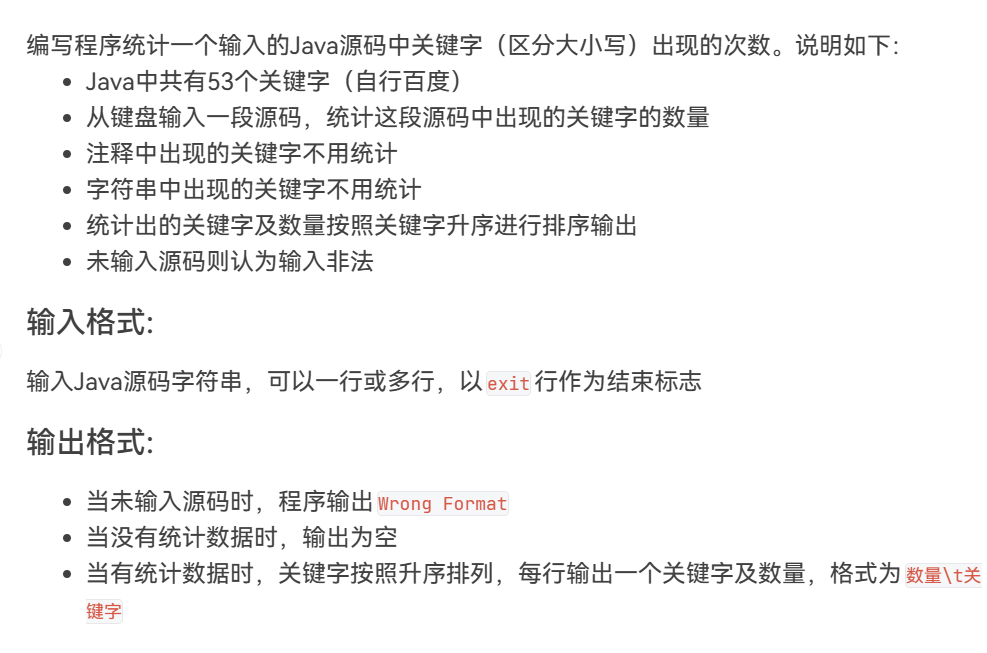 这道题目就是非常纯粹的对于字符串的处理的能力的训练了,包括在这道题目中使用容器hashmap以及set的使用,因为关键词具有唯一性的特点,这也在这道题目中得到了很好的使用,主要是分析,首先先对句子中是否包含了注释符号进行筛查,之后再是对于非注释内容进行处理,因为包含了各种符号,所以我使用replaceAll对于其中的非字符进行替换,替换成空格之后再对空格进行处理,多余的空格进行筛除,然后在调用spilt对于其进分割方便之后的统计,如果是key,那么其值+1,最后在对其进行排序最后输出,这道题目的难点主要是对于符号以及注释符的识别处理的困难,以及一些特殊情况要进行考虑,实际上这道题目还有一个要求就是写到60行以内,但实在是没有能力能够再压缩了,对于处理这方面,我认为是有更好地方法的,比如不使用replaceall的方法来进行代码的处理,这样的是可以减少代码的长度的.