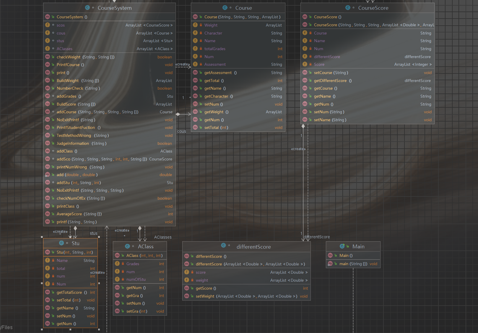 还是重构,但是相比于上次这道题目改写了很多,即使关于成绩设置方面,包括成绩的具体计算方式,以及使用的占比方法来计算,而且对于这道题目类图的重新设计使用问题,我个人认为还是组合更好用些,因为如果成绩的需求做出变化时,父类也因此要进行重新设计,而如果是组合的话,只需要修改组合的类的方法就可以了,而不用去修改调用它的类,这样不仅可以降低代码之间的耦合度,也可以方便代码后期维护时的修改.除此以外,还有就是对于精度损失问题,实际上在之前的题目集中也有出现过类似的问题,就是浮点数之间的计算会出现损失问题,就会导致1+1 !=2 这样的现象发生,对此,在网上对此查询之后发现java中的一类bigdecimal类可以解决这个方法,在调用其之后发现浮点数之间计算的问题消失了,这也算踩了一个坑吧.