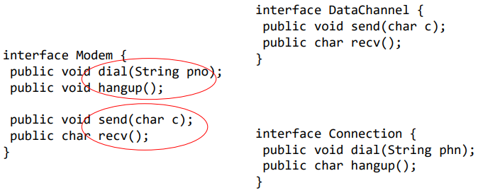 我们不要将所有方法整合到一个接口中,将其根据功能划分为不同的等价类接口,这样不仅能使客户避免了继承自己不需要的接口,还能提高聚合度。举个例子: