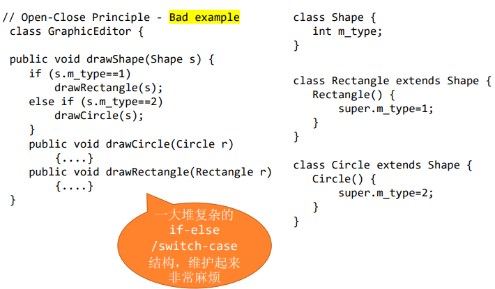 - 开放-封闭原则(OCP):对扩展性的开放,对修改的封闭。前者是指模块的行为应是可扩展的,从而该模块可表现出新的行为以满足需求的变化;后者则是指模块自身的代码是不应被修改的,扩展模块行为的一般途径是修改模块的内部实现,如果一个模块不能被修改,那么它通常被认为是具有固定的行为。对于这个原则,一般的实现的方法是抽象技术。举一个例子: