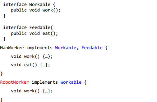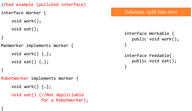 worker接口有工作和吃饭两个方法,但是子类RobotWorker不需要吃饭这个方法,引入了子类不需要的方法,有时候会带来很不好的影响。修改后如下: