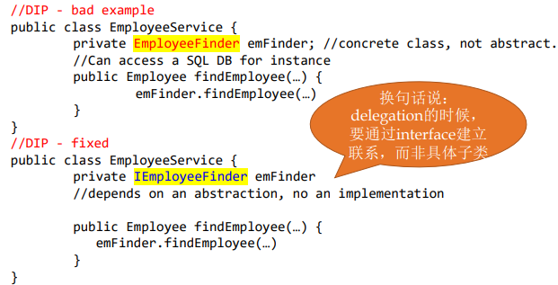 依赖转置原则(DIP):高层模块不应该依赖于低层模块,二者都应该依赖于抽象;抽象不应该依赖于实现细节,实现细节应该依赖于抽象 。一般可以通过委托(Delegation)来实现。一个例子如下: