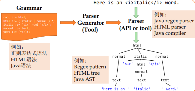 Grammar定义语法规则(BNF格式的文本),Parser Generator根据语法规则产生一个Parser,用户利用parser来解析文本,看其是否符合语法定义并对其做各种处理(例如转成parse tree)。