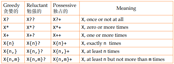 - Reluctant:从输入串的首(字符)位置开始,在一次尝试匹配查找中只勉强地读一个字符,直到尝试完整个字符串。