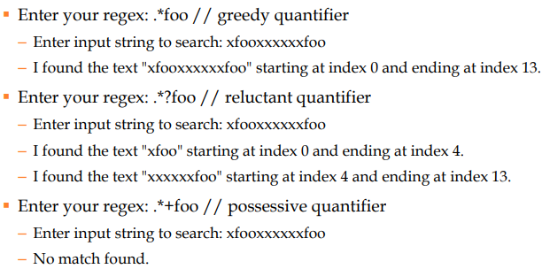 此处的“.”代表任意单个字符,所以“.*foo”代表形如xxxfoo的字符串,xxx可为空串,也可为一堆任意的字符。所以贪婪匹配得到的便是整个字符串,因为他是先整个读取若不匹配再从最后回退。同理勉强匹配得到的是两个字符串,因为他是一个个读取直到匹配,待到读完整个字符串便返回。对于独占匹配,它直接将整个字符串和给定形式匹配,这里正则表达式能代表的字符串前缀是任意的,而给定的字符串前缀是确定的xfooxxxxxx,所以匹配失败。(但是对于第三个例子,将".*+foo"换为“x*+foo”,将“xfooxxxxxxfoo”换为“xxxxxxfoo”就能正确匹配了,关键还是在于“.”的类似于通配符的作用使得第三个例子返回false。)