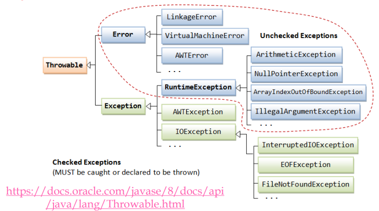 图中红色虚线圈起来的一部分包括所有的Error和RuntimeException都属于Unchecked Exception,其余异常都属于checked Exception(编译时异常),下一节中会具体讲到对二者的区别对待。