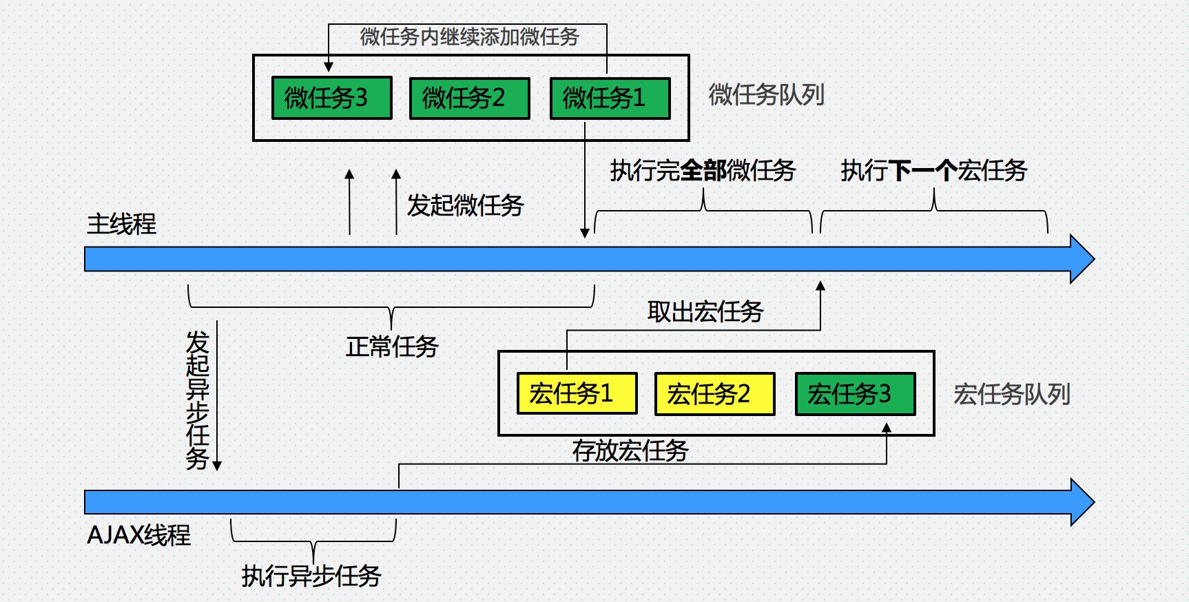 刚才我介绍过事件循环机制,我们知道,当一个任务执行完后,主线程会从macro-task队列(之前说的消息队列)中取出事件,开始下一轮的任务执行。而某些情况下,我们需要某些任务要在本轮事件循环结束前执行,于是,除了macro-task队列外,其实还有一个micro-task队列,里面存放本轮正常任务执行中添加的需要在本轮事件循环结束前、在本轮事件循环所有task结束后执行的任务。