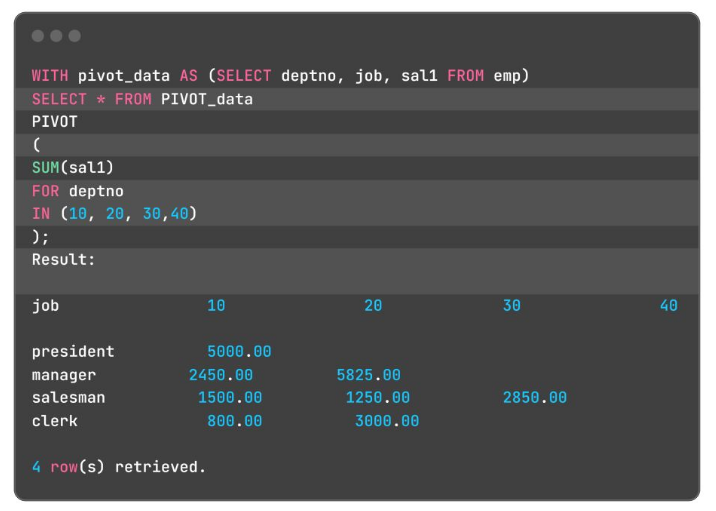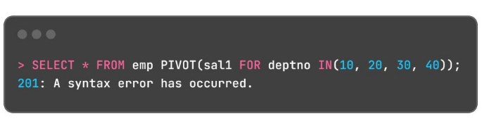 在 pivot_for_clause 中使用的列(如例子中为 deptno 列)不能出现在SELECT投影列中,在 pivot_for_clause 中的列会根据我们在 pivot_in_clause中提供的值的范围进行分组。下列中试图查询 deptno 列,会引发异常,因为这种情况下,deptno完全从投影中被移除了。