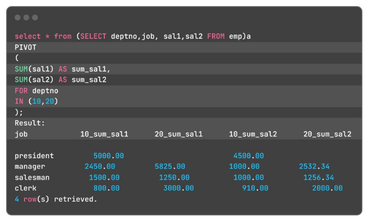 上面的例子中 pivot_clause 中定义 2 个聚合,这里得到的转换列是双倍(因为聚合的数量是双倍)。