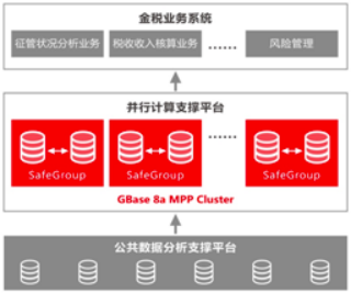 公共数据分析支撑平台负责从全国各省级税务部门采集税务数据,被采集上来的数据经过ETL工具处理后加载到GBase 8a MPP Cluster中,通过1:1备份的SafeGroup机制,保证了集群的数据安全和提高了并行计算能力,并向金税业务系统提供数据和计算能力支撑。