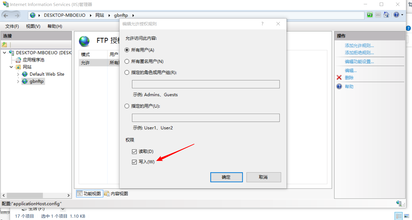遇到的坑是在上传的时候不能上传,我的不是中文命名问题,而是IIS配置权限问题,当时参考的百度经验里的ftp配置,结果权限中没有写入,导致不能上传。。。