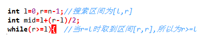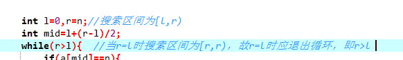 还是上面所述闭区间开区间的问题,当闭区间时右边界可以取到,mid已经排除过,故r=mid-1,当开区间时右边界取不到故r=mid